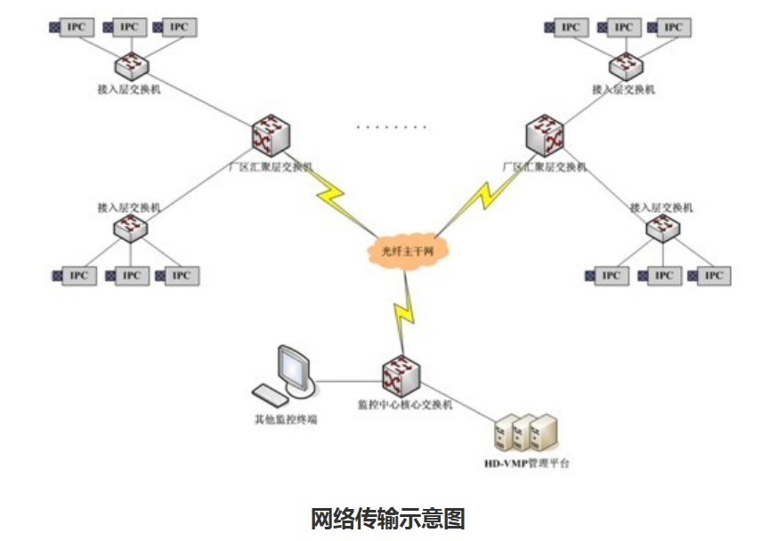 系統分為前端監控資源采集、視頻傳輸、后端平臺組建、多系統聯動建設等幾部分,整個系統采用全網絡數字視頻監控架構,前端都采用高清網絡攝像機進行視頻采集,通過攝像機的網絡端口直接接入到工廠視頻傳輸網絡中去,傳輸到后端進行集中存儲和管理。傳輸主干網采用千兆光纖網,后端通過HD-VMP集中管理平臺來完成整個視頻監控系統的集中預覽、控制、管理、存儲以及視頻分發等功能。實現工廠高清數字視頻監控系統集中管理。總體設計嚴格遵循用戶要求和行業規范,滿足用戶功能需求為主要目的,提高安全防范管理效率。