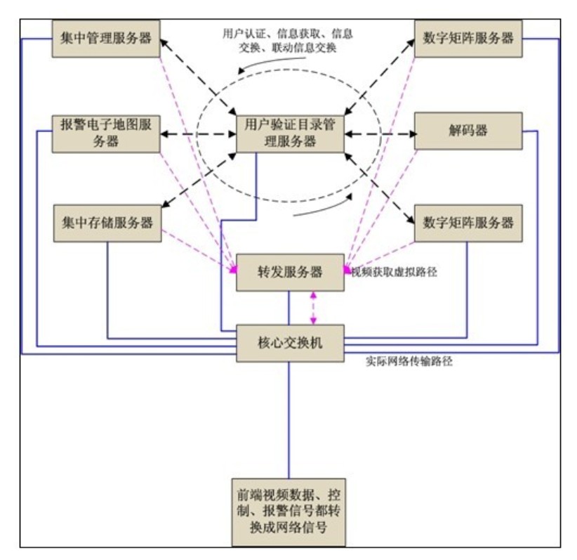 設計指揮中心部署一臺集中管理控制服務器(安裝管理控制軟件模塊),保衛分中心和生產管理部門各自部署一臺副控管理控制服務器(安裝副控軟件模塊);集中管理控制服務器硬件配置采用了滿足高清網絡視頻圖像處理能力的專業級服務器,能夠同時支持8畫面高清720P圖像解碼預覽、滿足全范圍信息收集顯示、具有快速響應等功能。分中心通過向指揮中心驗證服務器進行用戶驗證,通過后獲取各自管轄區域的視頻監控資源。