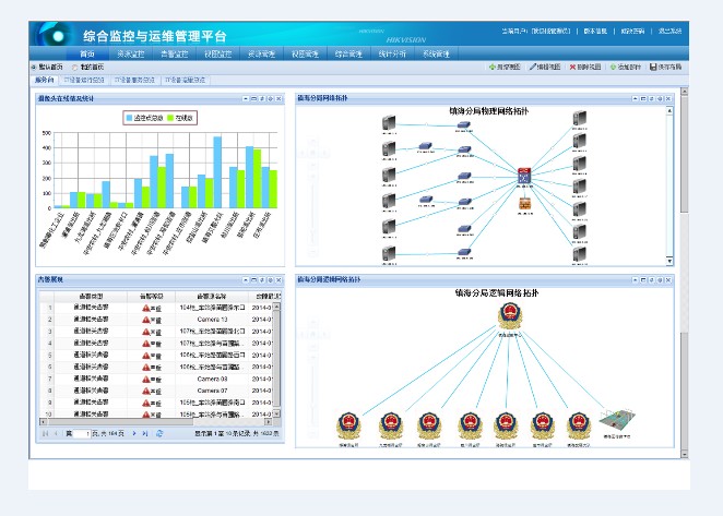 系統的穩定運行是保障各種業務的正常運作,??低暈橛脩籼峁┤W綜合監控與管理系統,支持對前端攝像機、后端視頻設備、業務服務器、存儲設備、網絡設備、數據庫、中間件、業務應用系統、機房動力環境等各類設備與資源的實時監控與管理,有效的降低了系統的潛在隱患。